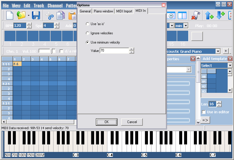 MIDI Tracker is music editor with ability to import and export songs to MIDI format, support of 128 instruments, assigning volume and tracks count, playing and editing from PC keyboard.
